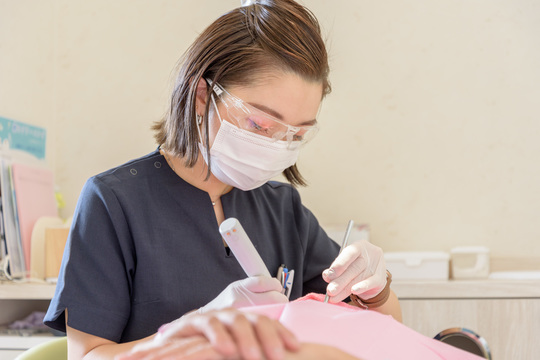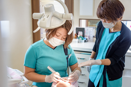 歯科医師、歯科衛生士、歯科助手はもちろん、栄養士、管理栄養士、保育士も在籍している当院では、多くの職種のスタッフと連携しながら仕事を進めていきます。スタッフの人数が多く同じ職種でも色々なタイプの人がいるため、それぞれのやり方を知っていくことで、学ぶことも多いのではないでしょうか。たくさんの人と関わる毎日の診療そのものが学びにつながる、それも魅力のひとつです。